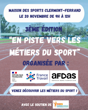 L'Afdas et France Travail (agence de Clermont Flaubert) organisent la 3ème édition de l’évènement « En piste vers les métiers du Sport ! », avec le soutien de l'Office Municipal du Sport de Clermont-Ferrand